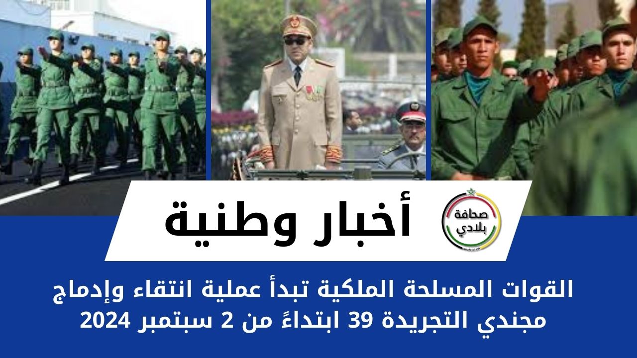 تنفيذاً للتعليمات السامية لصاحب الجلالة الملك محمد السادس، القائد الأعلى ورئيس أركان الحرب العامة للقوات المسلحة الملكية، ستبدأ مراكز تكوين المجندين عملية انتقاء وإدماج مجندي التجريدة التاسعة والثلاثين (39) للخدمة العسكرية، ابتداء من 2 سبتمبر 2024، وفقاً لما أفاد به بلاغ للقيادة العامة للقوات المسلحة الملكية.
