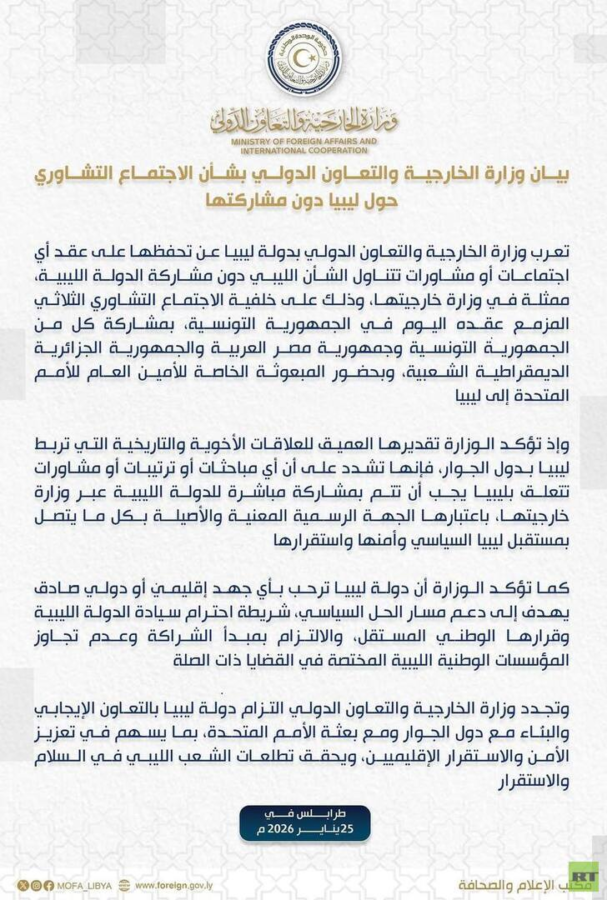 وأوضحت الوزارة أن ليبيا ترحب بأي جهد إقليمي أو دولي صادق يهدف إلى دعم مسار الحل السياسي، شريطة احترام سيادة الدولة الليبية وقرارها الوطني المستقل، والالتزام بمبدأ الشراكة وعدم تجاوز المؤسسات الوطنية المختصة في القضايا ذات الصلة.