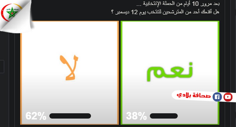 نشرت إحدى الصفحات الجزئرية على موقع التواصل الاجتماعي “فيسبوك”، استطلاع رأي، حول الأيام الاولى للحملات الانتخابية، حيث طرحت الصفحة السؤال التالي: هل أقنعك أحد من المترشحين لتنتخب يوم 12 ديسمبر ؟.