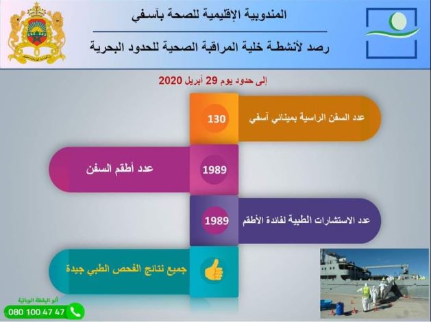 أكدت المديرية الإقليمية لوزارة الصحة بآسفي في بلاغ لها نشرته مساء أمس الأربعاء 29 أبريل 2020، خلو جميع اطقم السفن التي كانت راسية بمينائي آسفي الميناء المعدني الجديد والميناء التجاري من أية إصابة بوباء كورونا كوفيد 19.
