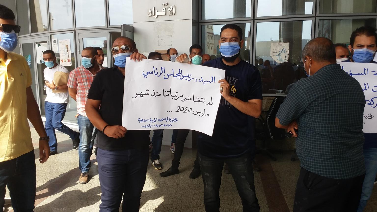 احتج عدد من الموظفين في شركة الخطوط الجوية الافريقية، اليوم الأحد، أمام مصرف الواحة بغوط الشعال، للمطالبة بالإفراج عن رواتبهم منذ ستة أشهر.